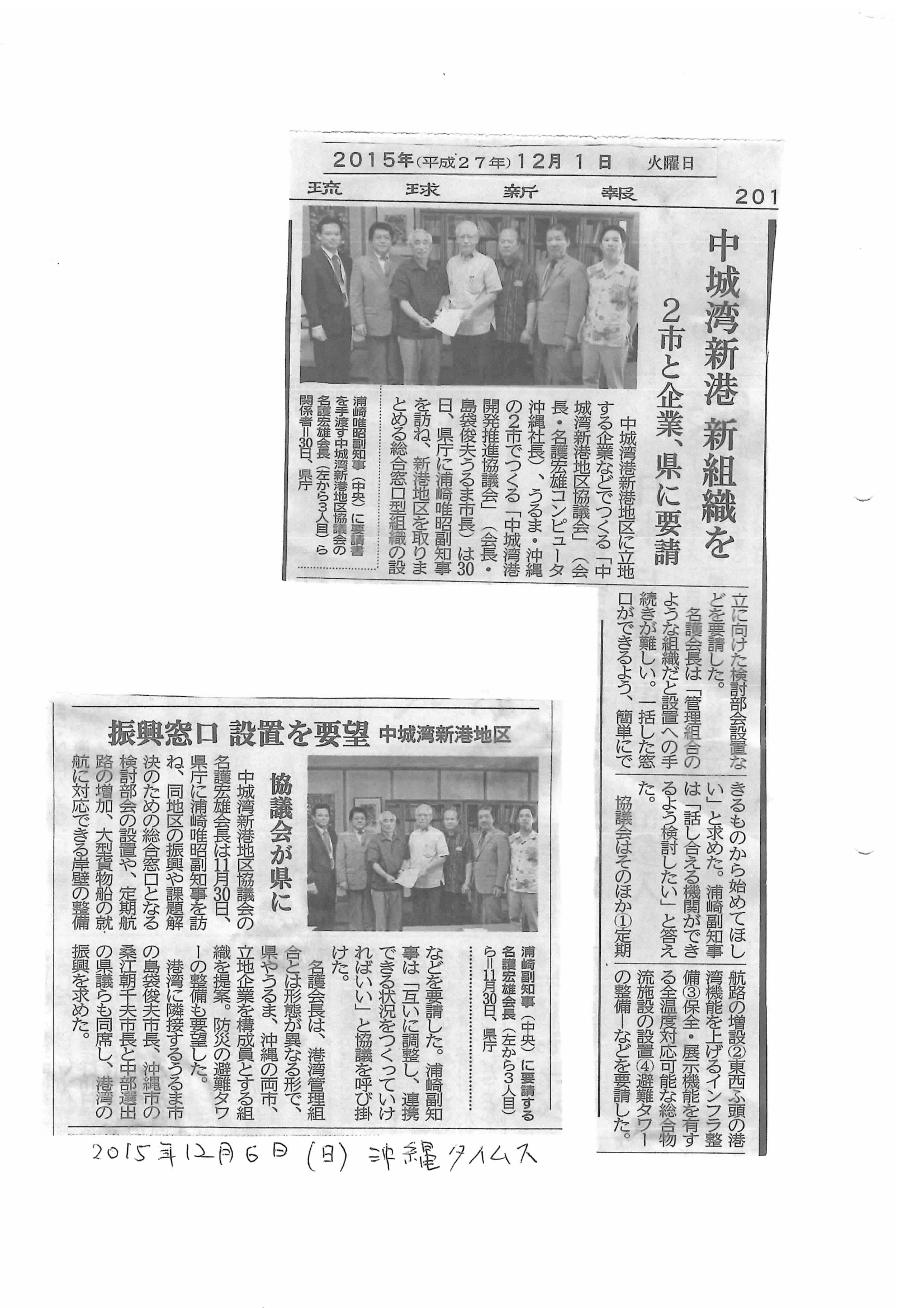 【中城湾新港 新組織を 2市と企業、県に要請 -琉球新報 2015年12月1日-】