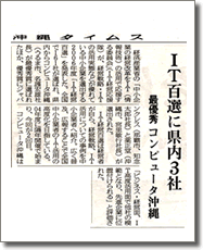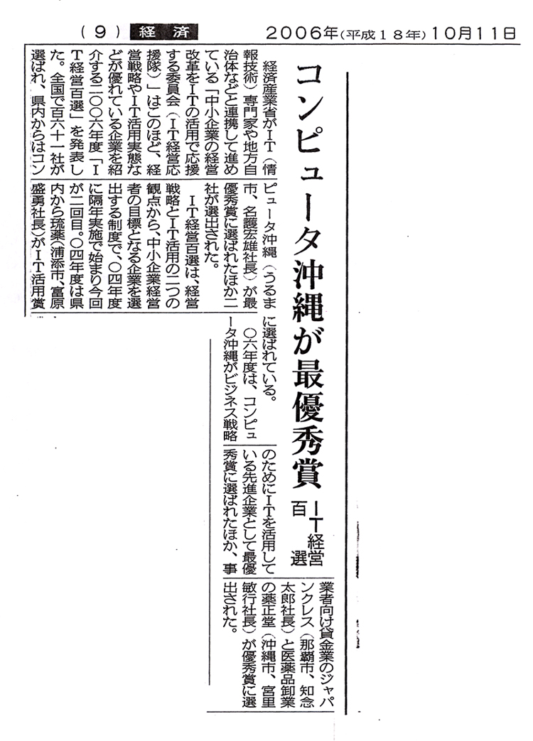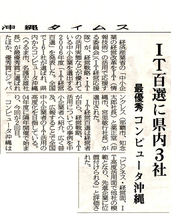 弊社はIT経営応援隊の「平成18年度IT経営百選」に応募し、おかげさまで沖縄県では初となる最優秀賞を受賞いたしました。